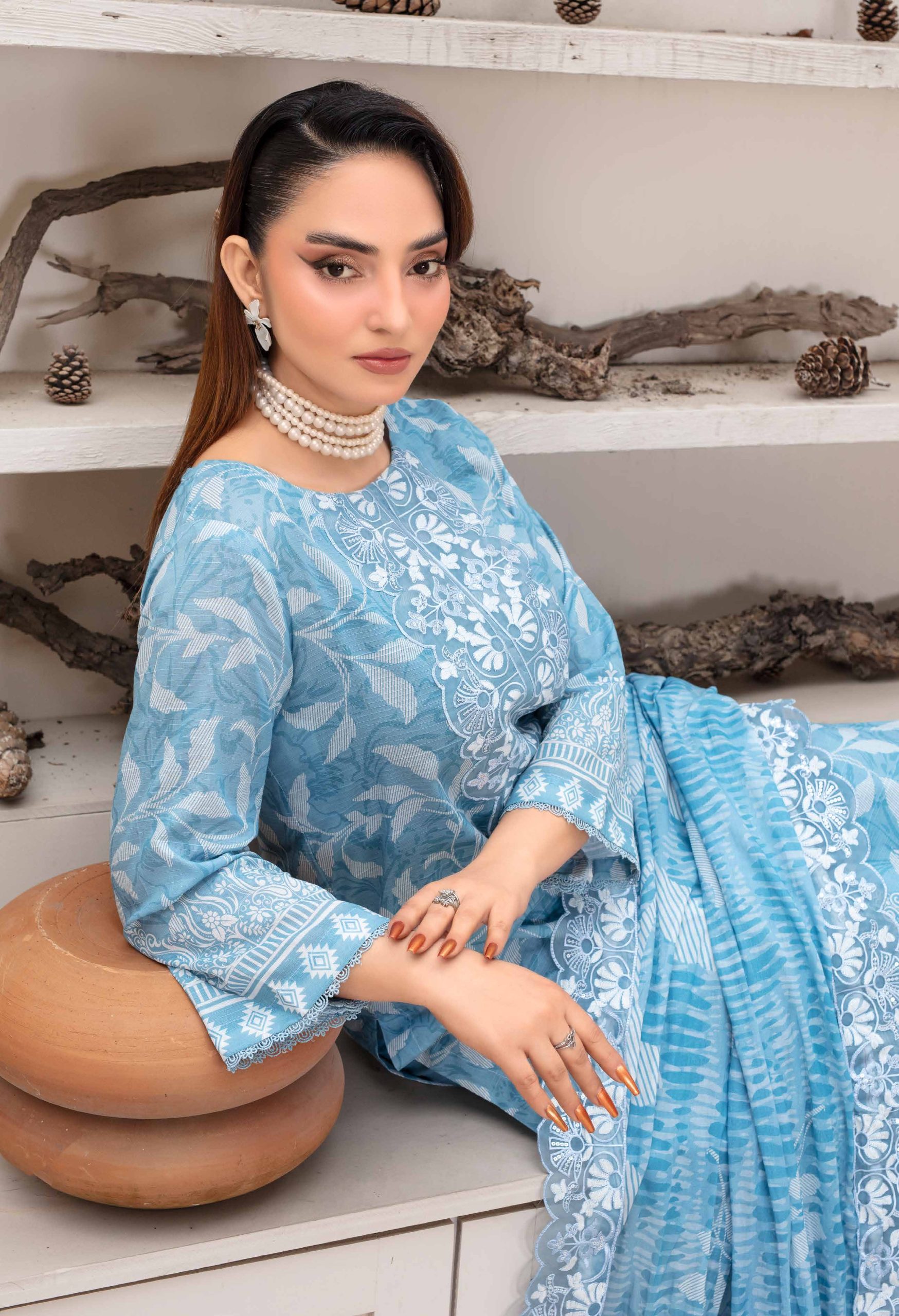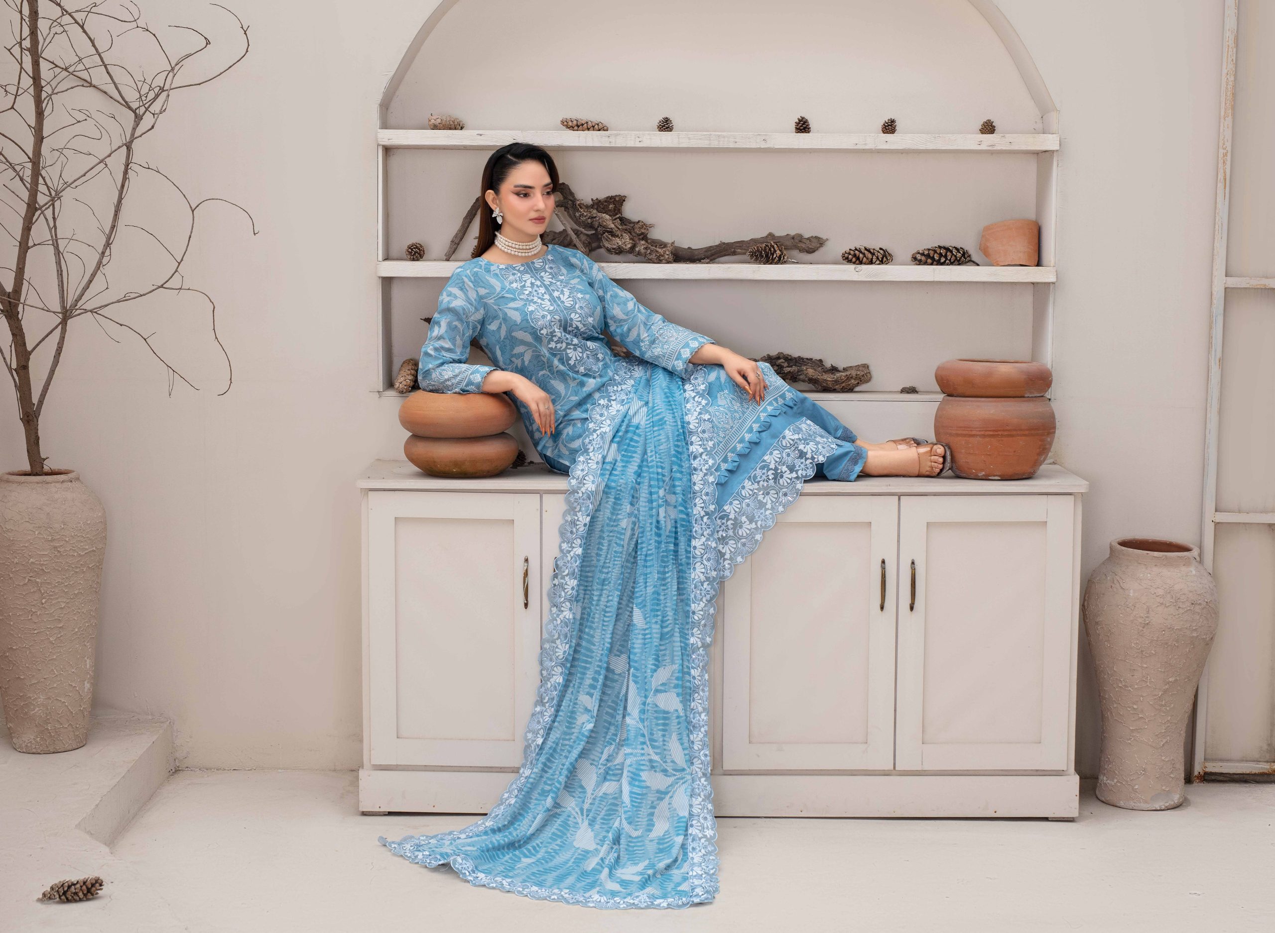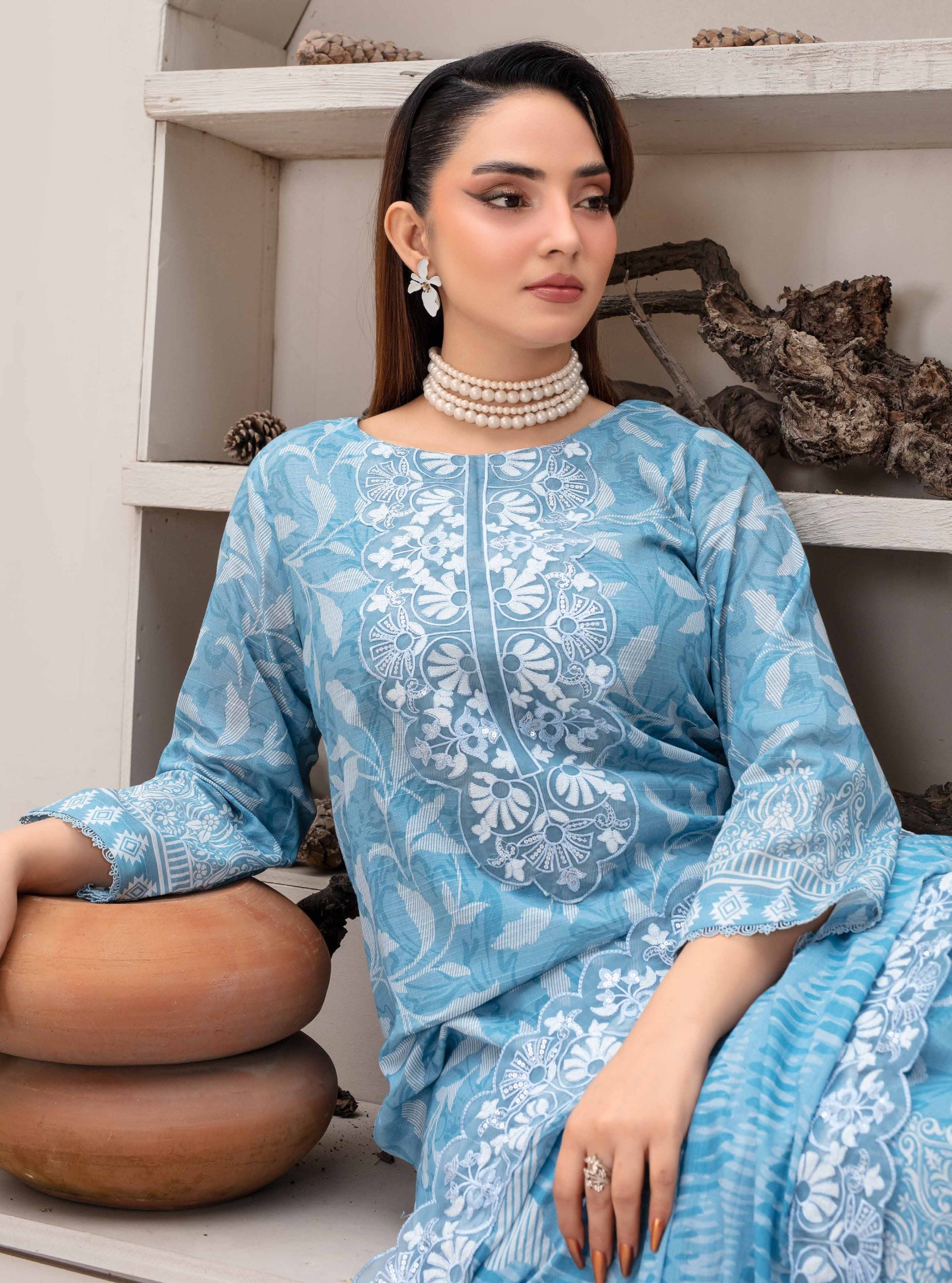 The shirt features a beautiful digital print with embroidery patch work, adding a luxurious and refined touch. It is paired with a digitally printed voile dupatta with 4-side lace finishing, enhancing the overall grace of the outfit. A comfort dyed trouser completes the set, making it suitable for both casual and semi-formal wear.