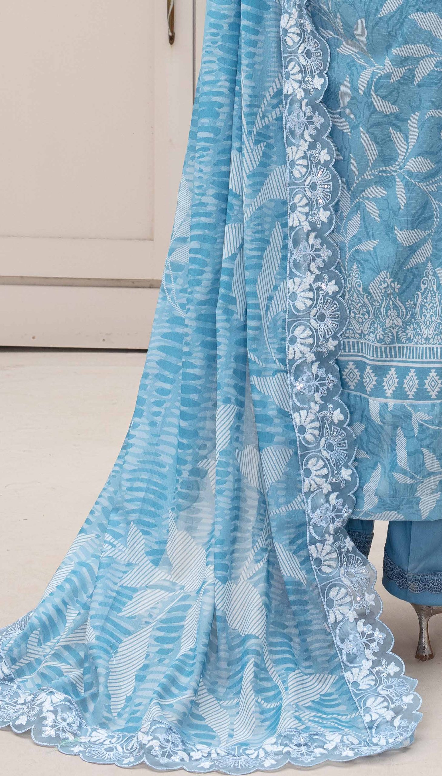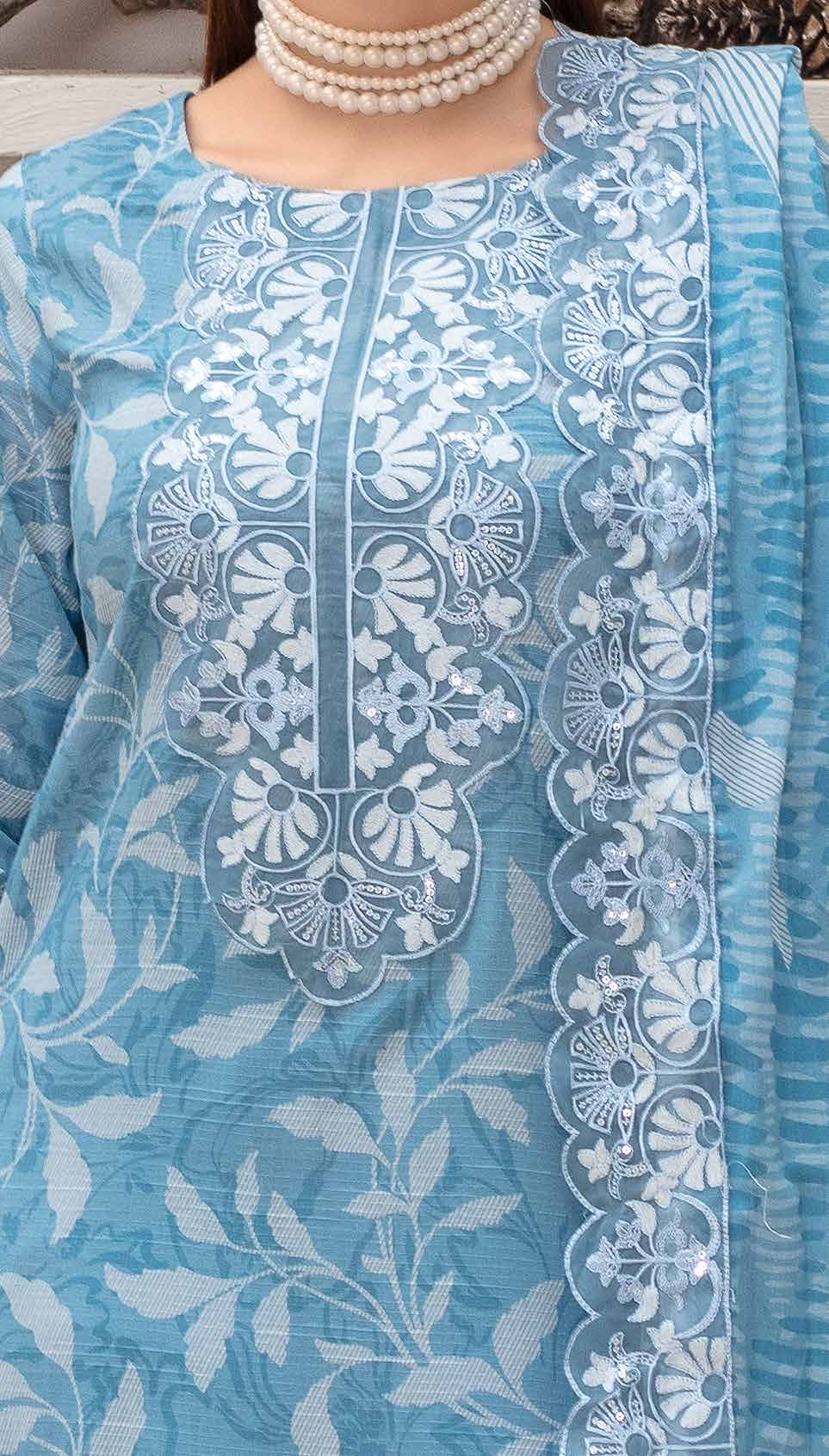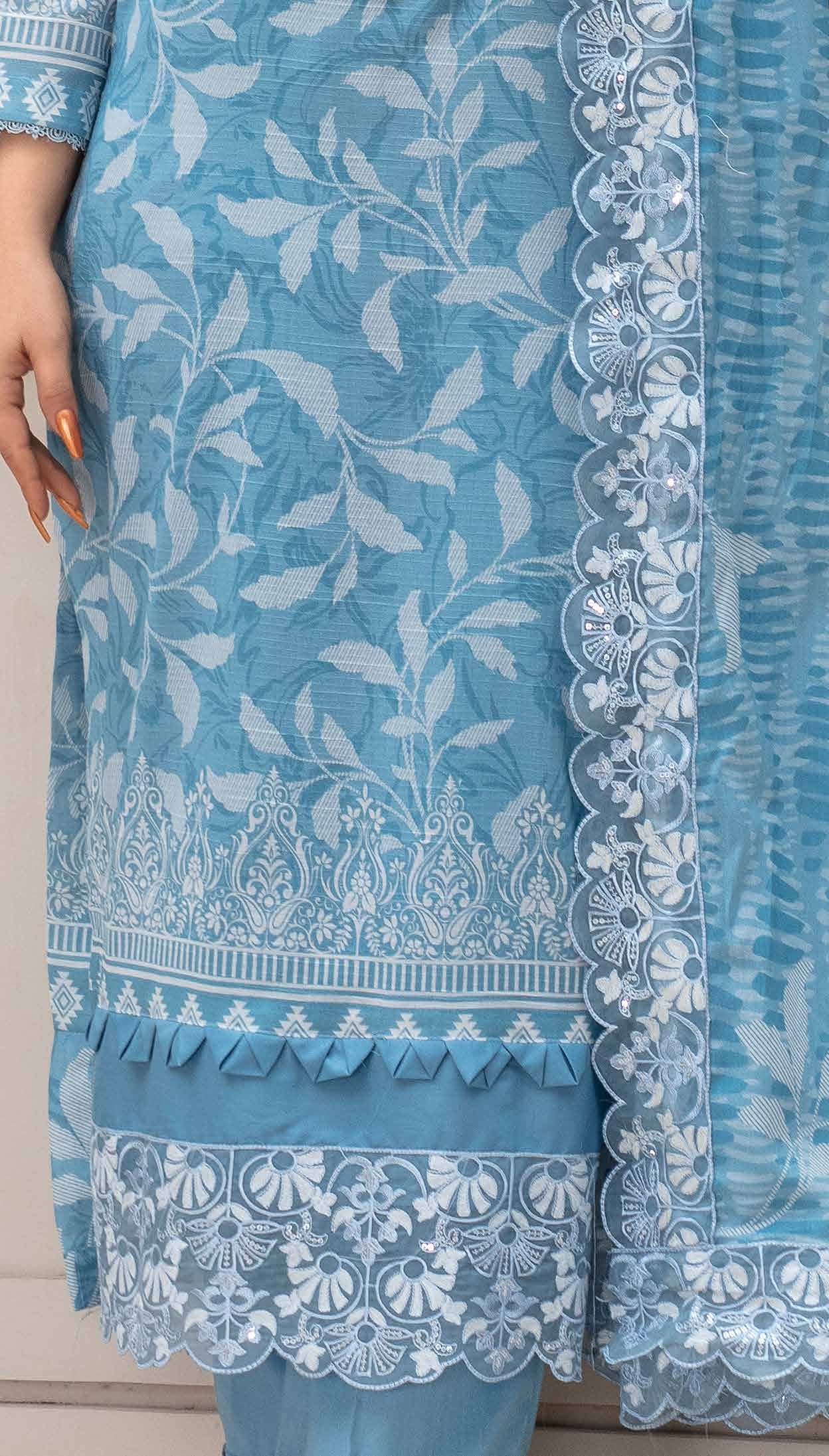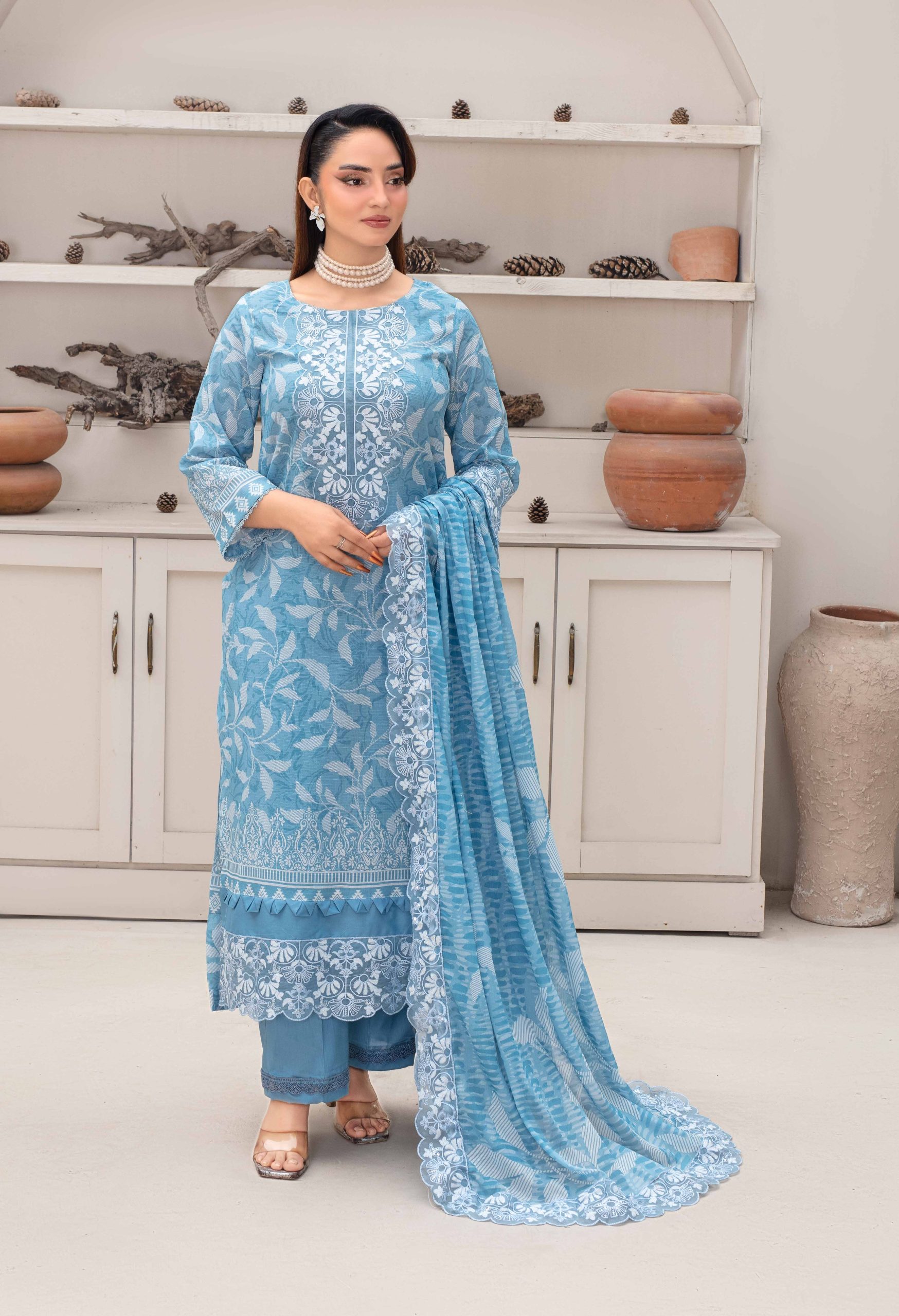 The shirt features a beautiful digital print with embroidery patch work, adding a luxurious and refined touch. It is paired with a digitally printed voile dupatta with 4-side lace finishing, enhancing the overall grace of the outfit. A comfort dyed trouser completes the set, making it suitable for both casual and semi-formal wear.